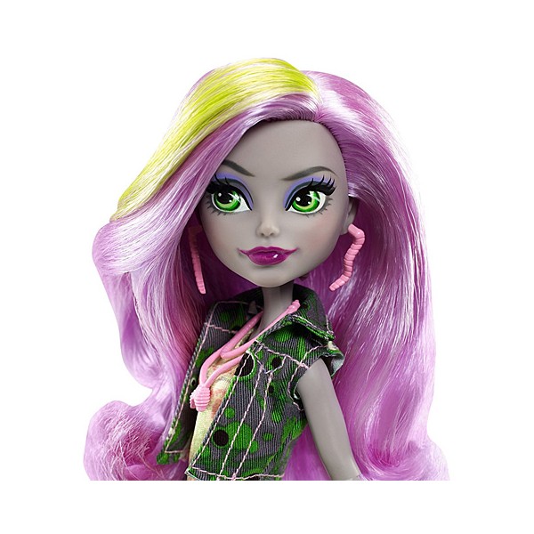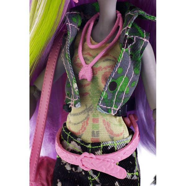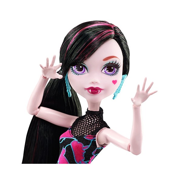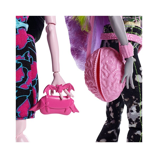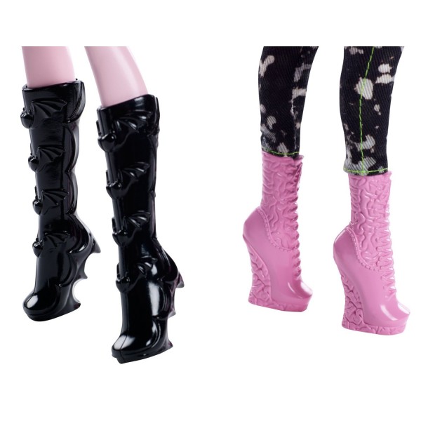 Draculaura, fiica lui Dracula poarta o rochie fantastica roz cu imprimeuri in forma de liliac si cizme negre, la care se adauga o geanta roz cu un liliac.